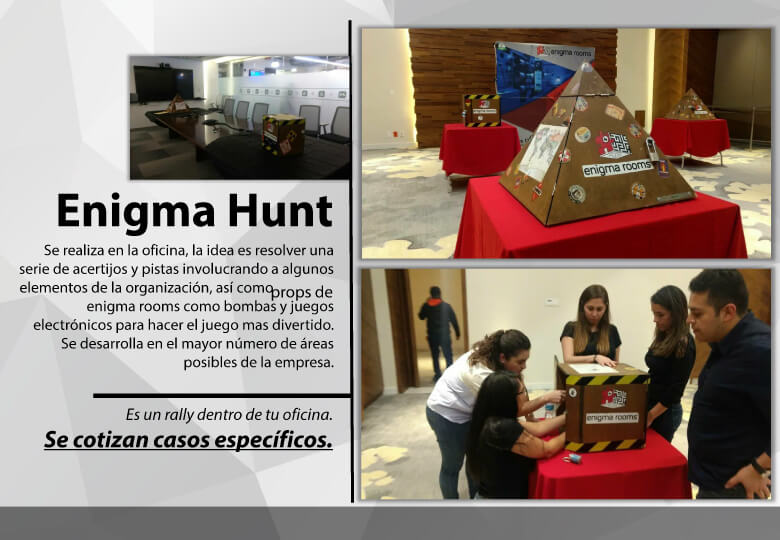 Se realiza en la oficina, la idea es resolver una serie de acertijos y pistas involucrando a algunos elementos de la organización, props de Enigma Rooms@ como bombas y juegos electrónicos para hacer el juego más divertido. Se desarrolla en el mayor número de áreas posibles de la empresa.